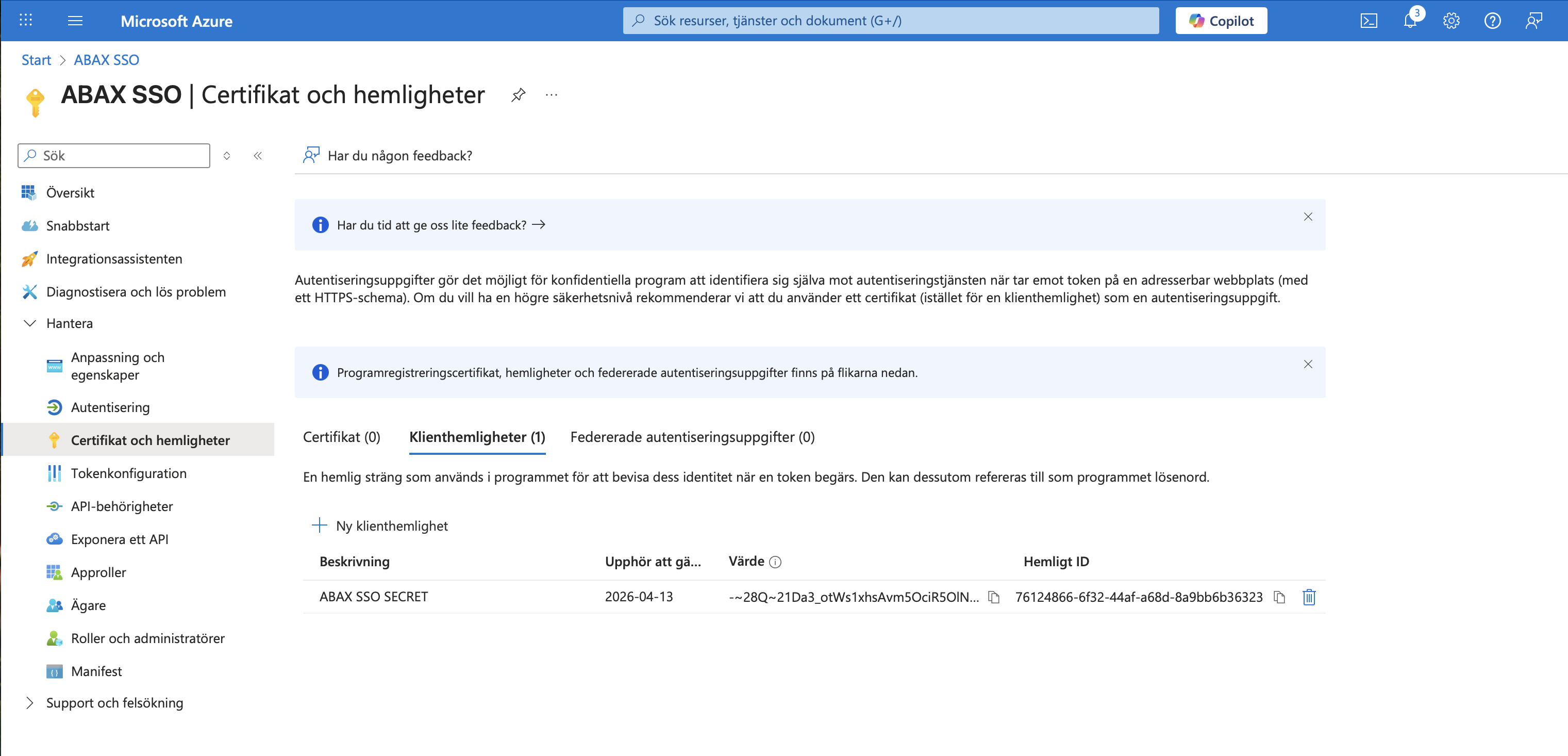 Spara värdet av hemligheten efter att den skapats. Du kommer inte kunna se detta värde igen. Om du förlorar hemligheten innan du konfigurerar SSO i ABAX måste du skapa en ny.