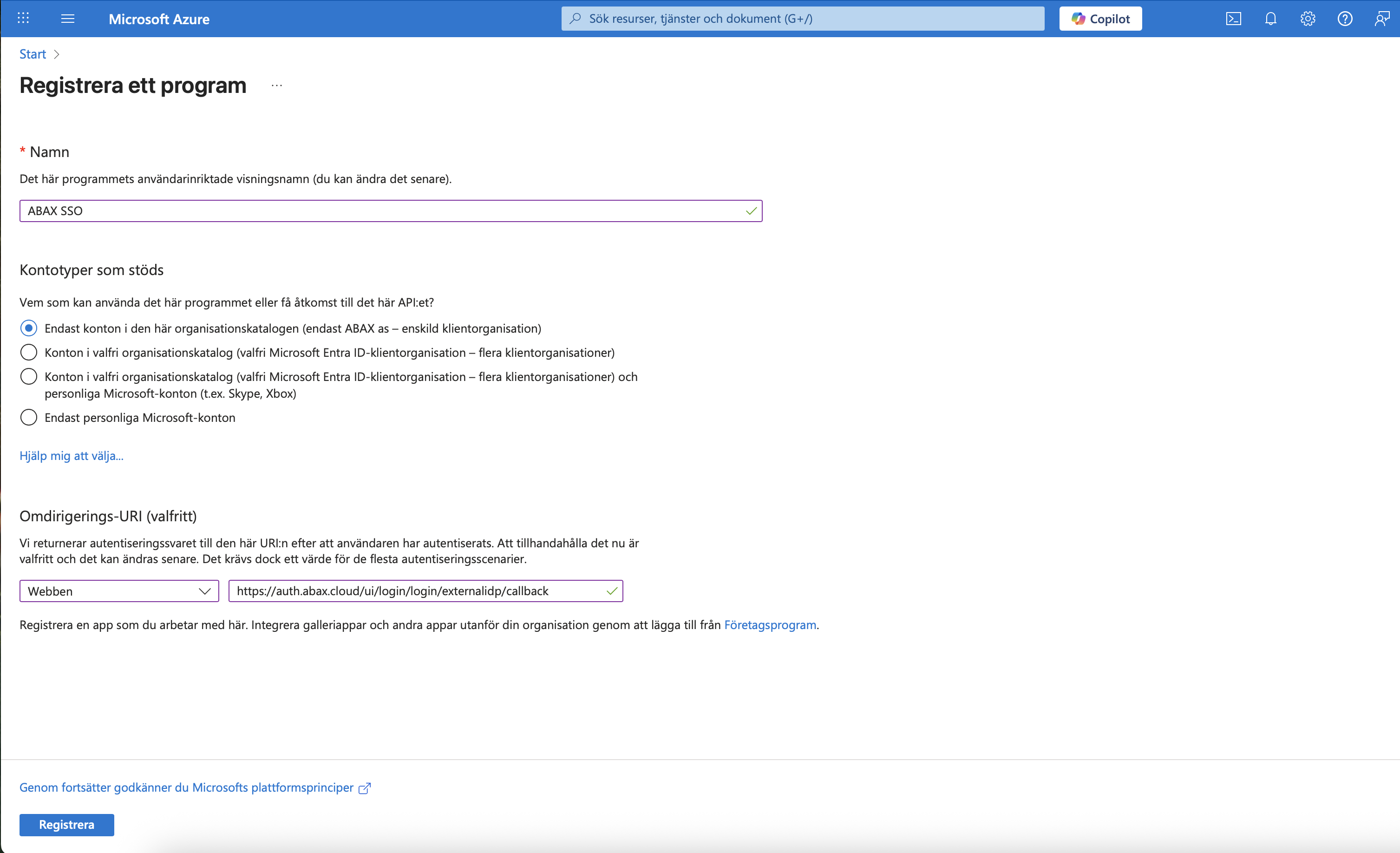 I sektionen Omdirigerings-URI, välj Webben och ange följande länk: https://auth.abax.cloud/ui/login/login/externalidp/callback