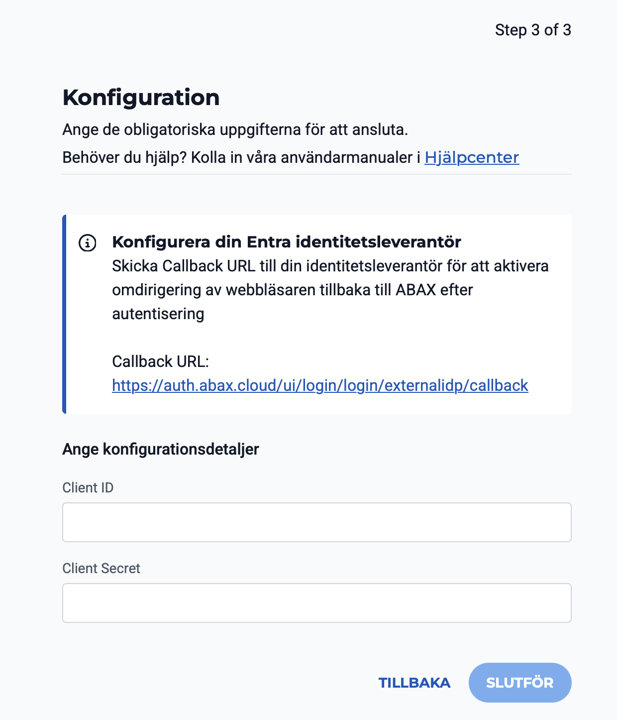 Dina konfigurationsdetaljer kommer att visas efter att ABAX har konfigurerat din installation. Du kan verifiera att konfigurationen fungerar korrekt genom att logga ut och logga in igen via SSO